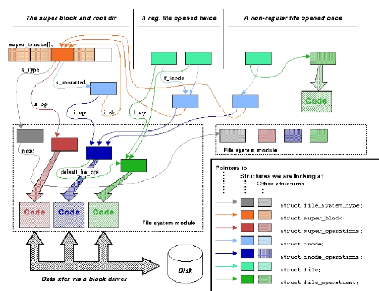 In practice, a super block structure encloses a field struct super_operations *s_op, an inode encloses struct inode_operations *i_op and a file encloses struct file_operations *f_op.