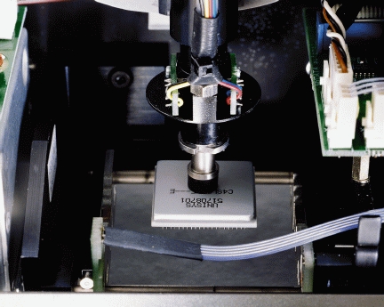 As each component must be placed with a much higher precision than the carriers in which it was delivered, some means of centering the component on the tool is needed. Thus, two centering jaws push the component to the middle of the tool tip, while the dimensions of the component are measured. Then the tool and component turn 90 degrees and the centering and measuring is done in this direction, too. Finally, the electrical properties of the component are measured. (See Figure 3.)