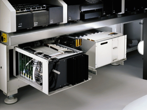 Figure 6. A MYDATA machine with the front cover removed. The computer box is in the left, revealing several servo computers. The Pentium motherboard is hidden in front. The box on the right contains battery backup and other electronic components.