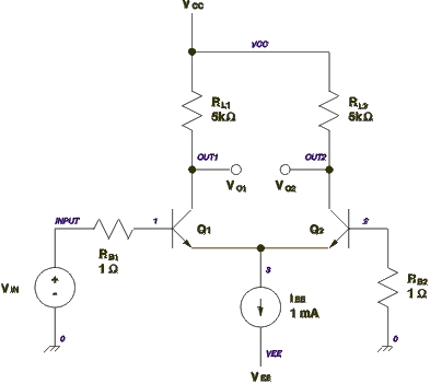 Figure 1 shows a the schematic of a differential pair circuit constructed from bipolar junction transistors and resistors. This circuit can be used for either digital or analog purposes and, in either case, can be simulated using SPICE. The circuit operates in the following manner. Very little current flows through the base of transistor Q2, so the base can be considered to be held near ground potential, zero volts. When the input voltage, VIN, is low, near ground, Q1 will be off and Q2 will be on. No current will flow through Q1, so VO1 will be high, equal to VCC. All of the current in IEE will flow through Q2. The voltage drop across RL2 will be: