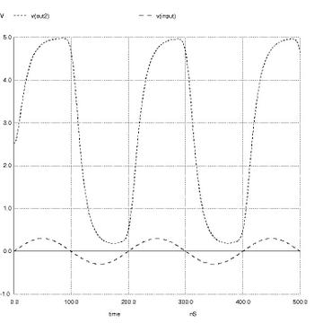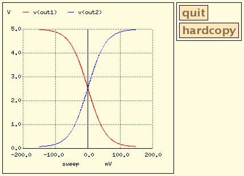 The DC transfer characteristic plot shows output voltage, from left to right, ranging over 0V to 5V and shows the input voltage, from top to bottom, ranging from -0.15V to +0.15V. Each time I view a plot like this I get nostalgic, recalling the days when I would flip switches on the front panel of a PDP-8 and load boot programs from paper tape. But that's another story. This plot certainly isn't fancy by today's standards, but it does convey the necessary information.