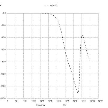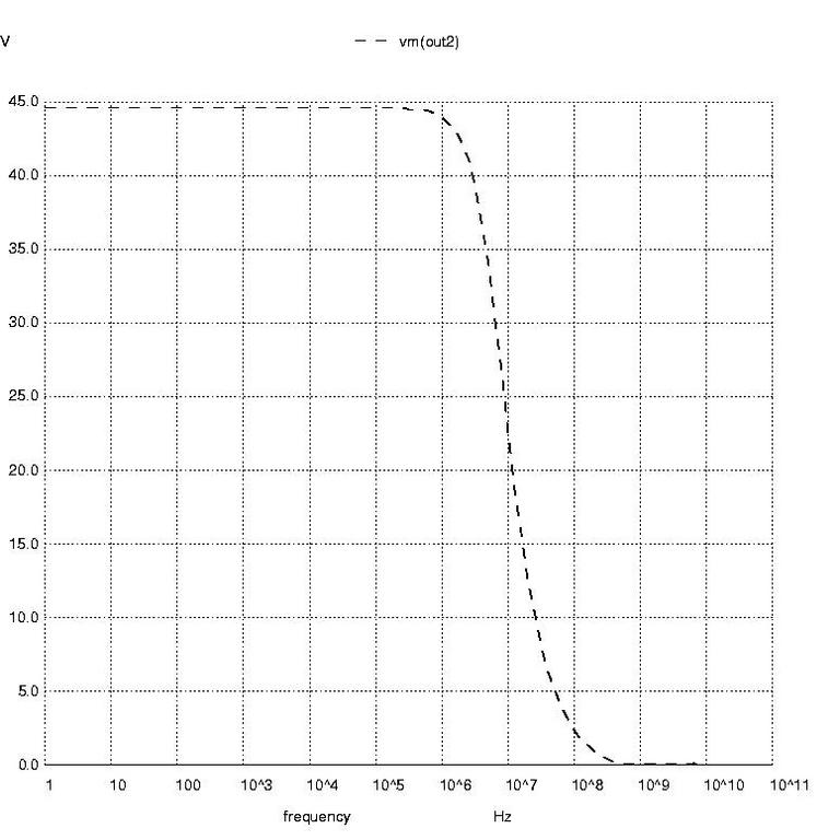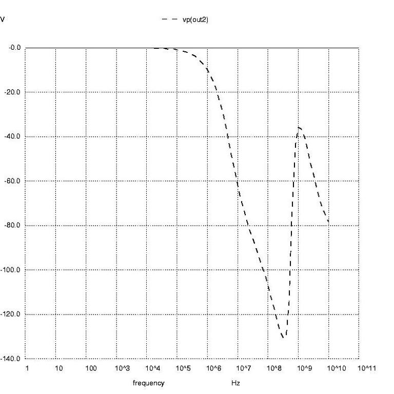 Nutmeg prompts 11 through 16 create the AC analysis plots of voltage phase at node out2 in degrees, voltage phase at node out2 in radians and magnitude of the voltage at node out2. These are shown in Figures 3 through 5, respectively.
