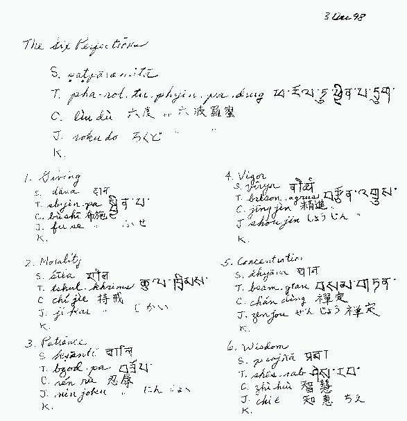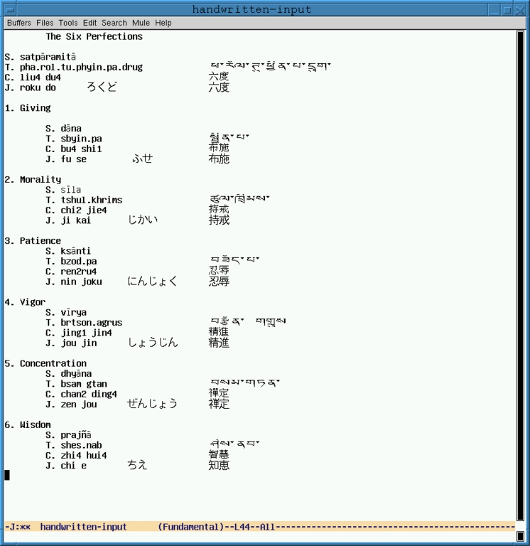 As an example of using Emacs to prepare multi-script reference material, let's look at the Buddhist numerical lists I am currently working on. Without much difficulty, I can write this list with a pen on a piece of paper. See Figure 1 for a bitmap of a page from my handwritten list. (Apologies for my poor calligraphy.) To get these scripts into a computer text file requires an input method specific to each script. Fortunately, Emacs comes with Quail, which has a method to input each script in this example and many more.
