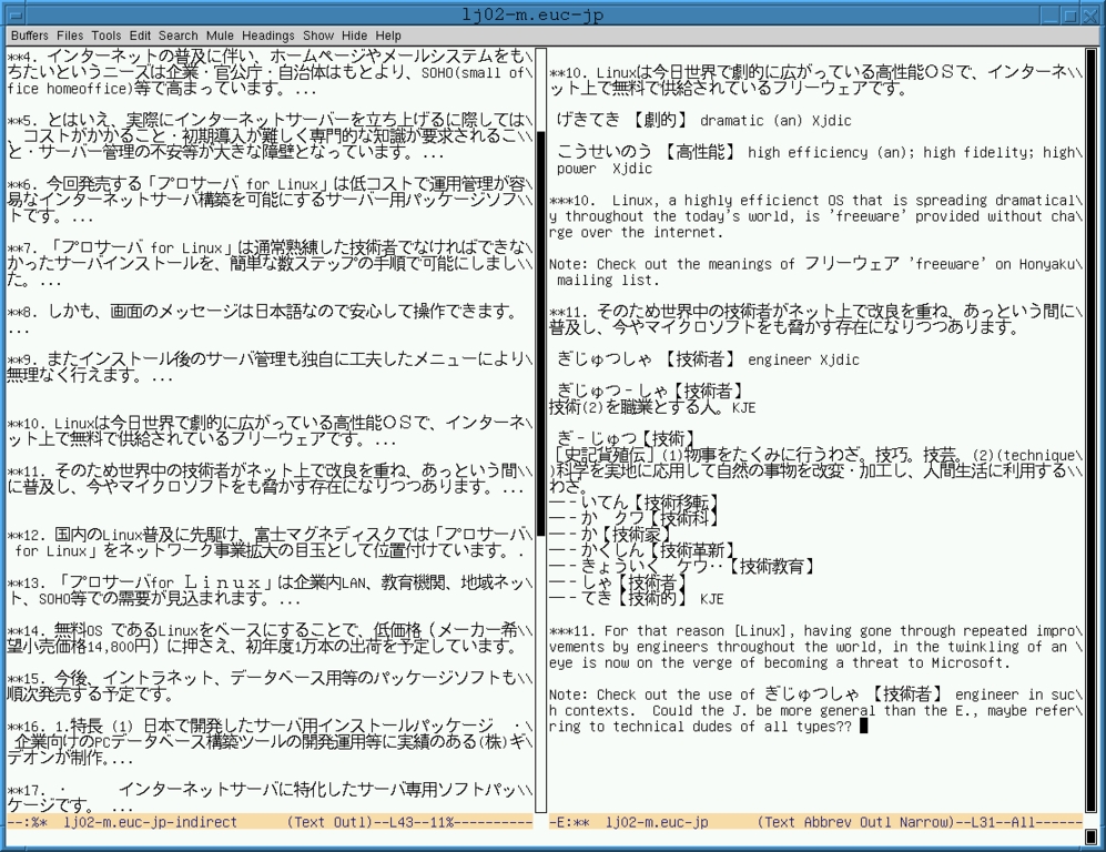 In Figure 3, what you see is reduced to just the Japanese source text and the English target text, i.e., level 2 and level 3 outline “heading lines”. In Figure 4, what you see is expanded to include snips from on-line dictionaries, notes and comments, i.e., outline “body lines”. But the accessible portion produced by narrowing is the same in both cases. For Figures 3 and 4, I used outline mode to keep source text, translation, abbrevs, glossary entries, notes and commentary all in one file. The left buffer shows only level 2 outline header lines, i.e., the Japanese source text, whereas the right buffer in Figure 3 shows this plus the target text and Figure 4 shows all three: source, target and notes.