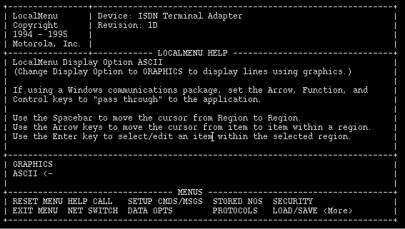 Now the fun part: configuring the Bitsurfr Pro. The Bitsurfr Pro requires a full VT100-compliant terminal emulator to use its local menu. During my testing, I have found only Seyon to work—Minicom did not work for me—run Seyon (i.e., seyon - modems/dev/cua1). Type AT to get the Bitsurfr's attention. Then type AT@MENU. The local menu will appear as shown in Figure 1.