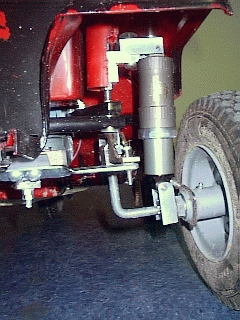Robocar must withstand a fair amount of stress while traveling across the bumpy course (grass, sand, simulated pavement, wooden ramps). Vibrations need to be dampened to get clean, useful video—try driving down the road while looking through a jiggling video camera some time, and you'll get a fair approximation of Robocar's vision of the world. Besides, we don't want the hard drives bouncing around all over the place; therefore, all four wheels have shocks to help reduce the vibrations, and our mechanically fragile equipment is mounted on foam.