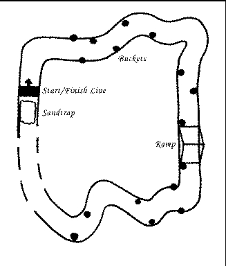 The course track is defined by white or yellow lines painted on the grass, and the robot must stay within these lines. Obstacles of various sizes, sand traps, deep grades and sharp curves occur along the way to keep things exciting. The difficulty increases as the robot progresses down the course. In addition to navigating the pathways, the robot must carry a 20 pound load and cannot exceed a speed limit of five miles per hour. Each robot has three tries at navigating the course, and the winner is chosen based on the time used and distance traveled. Penalties are assessed for crossing lines and hitting obstacles. So far no team has successfully navigated the full length of the course.