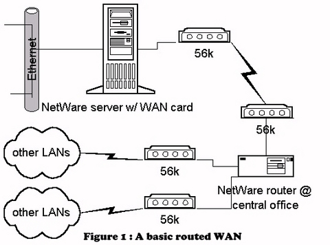 Originally, we used a routed 56K solution such as that shown in Figure 1. This worked relatively well for our Novell network. However, it required that all of the traffic be routed. This is fine for NetWare, which uses protocols such as RIP to automatically configure routes. However, in order to pass TCP/IP data, it would be necessary to break our class C range of IP addresses into a number of smaller subnets. This would result in a net loss of available IP addresses and add to the bandwidth problem.