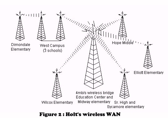 Since 1993, the computer networking world has been turned upside down, and we recognized the need to update our system. In addition to the need for greater bandwidth for applications, getting Internet access to the classrooms has become a must. Public schools have always been faced with tight financial budgets and implementing a major change in a network is usually quite costly. Because of these factors, our district was forced to examine alternative ways to upgrade our system. Through the combination of two key technologies, spread spectrum wireless WAN links and Linux proxy servers, we were able to provide what our district wanted: a system that is highly functional and low in cost. In fact, based on our financial calculations, the entire system (including the Linux machine hardware) should pay for itself within 5 years, based solely on the recurring costs of six leased lines.