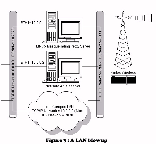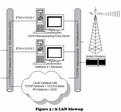 At each of the individual LAN segments, we have a configuration similar to the picture in Figure 3. The wireless link is plugged into a small hub, which is also connected to the NetWare server and Linux box. The NetWare server is responsible for routing the IPX/SPX traffic and the Linux box is responsible for the TCP/IP traffic. All of the client workstations are configured for the 10.0.0.0 network and have their Linux box set as the default gateway. When a client sends TCP/IP traffic, it goes through the Linux box, out through the wireless link, to the education center and eventually out to the Internet.