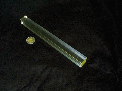 Our experimental physics group is now involved in a multi-disciplinary R&D project (see Resources [2]) related to the construction of one of the two detectors, CMS (Compact Muon Solenoid). In particular, we are studying the characteristics of a new crystal, the lead tungstate or PWO, which, when hit by a particle, emits visible light. About 100,000 small PWO bars (Figure 1) will compose the part of the CMS detector called the “electromagnetic calorimeter”, which will measure the energy of all the electrons and photons created in the collisions.