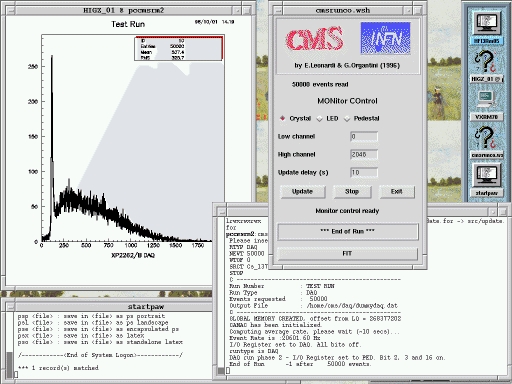 Parallel to the DAQ program, we wrote a program to monitor the status of the data acquisition and of some important parameters such as the number of events collected, event rate and average values. With a scientific libraries package called CERNLIB (see Resources [6]) developed at CERN, freely available along with its source code and widely used in the high-energy physics community, we interfaced the monitor program to a simple analysis facility. This allowed us to access interesting information and execute some preliminary analysis even while the DAQ was being done (Figure 4).