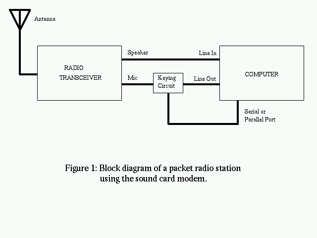 My first introduction to packet was using the sound card modem driver with a hand-held 2-meter band transceiver for 1200bps packet. The audio connects from the PC sound card to the radio's microphone and speaker jacks. A signal from a serial or parallel port in conjunction with a simple (one transistor) circuit is used to control the radio's PTT (Press To Talk) circuit. This approach requires no TNC and no packet modem—if you already have a computer and sound card this costs almost nothing. Figure 1 shows a block diagram of my setup.