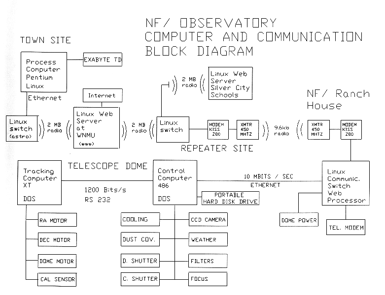 This node is located at the NF/ ranch and is the one that uses the antenna shown in Figure 1. When we built the telescope in 1986 there was no telephone service to the ranch. In fact, there wasn't even commercial power to the ranch until 1984! The three media types used here are ham radio, coaxial Ethernet and telephone modem. Ham radio has been in use for 10 years and predates Linux. The radio link receives information used to program the observing list for the telescope. It also transmits the pictures and telemetry from the telescope back to the data reduction computer and the Internet connection in Silver City.