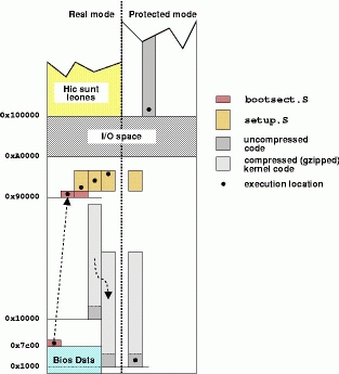 Booting an x86 kernel is a tricky task because of the limited amount of available memory. The Linux kernel tries to maximize usage of the low 640 kilobytes by moving itself around several times. Let's look at the steps performed by a zImage kernel in detail; all of the following path names are relative to the arch/i386/boot directory.