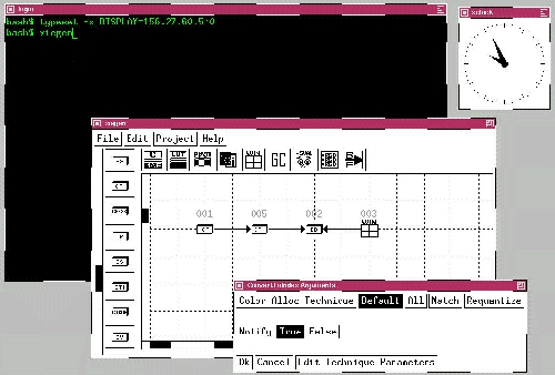 For most of you, the client and server are both running on the same machine, i.e., on a single Linux system, but it doesn't have to be that way. The X Window System protocol is designed so that communication between the client and server can be carried out over a network connection, e.g., TCP/IP. (If run locally, it is a local, i.e., AF_UNIX, connection.) Therefore, you can have the situation as illustrated in Figure 1. There, the X server is my Linux machine at home. The clock application and terminal emulator (xterm) are processes running on my Linux machine locally. In addition, I have a PPP connection to my ISP (which is running Solaris or some other Linux-wannabe) and within the xterm I am executing a telnet session between my local machine and the ISP. The other two windows (xiegen) display an application executing remotely on my ISP's machine. This application is displaying its client windows on my Linux machine, responding to keyboard and mouse events that occur on my Linux machine, courtesy of the X protocol. Prior to executing the remote application, I needed to set the DISPLAY environment variable to the IP address of my Linux machine which acts as the server. Xlib (on the remote host) reads this variable on client startup and uses its value to open a connection to the X server running on my Linux machine. The :0 characters in the following line indicate a logical display on the server: