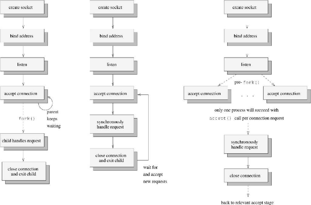 In Figure 1, the diagrams show three potential designs for a daemon providing a network service to prospective clients. In the first picture, the daemon follows the most common technique of forking off a separate process to handle the request, while the parent continues to accept new connection requests. This concurrent processing technique has the advantage that requests are constantly being serviced and may perform better than serializing and iteratively servicing requests. Unfortunately, forks and potential context-switches are involved, making this approach unsuited to servers with very high demand.
