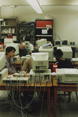The lab began in the late summer of 1995 with six Pentium 90 machines running Red Hat Linux version 1.0. We made an effort to buy only hardware that supported Linux: IDE disk drives and CD-ROM, SCSI tape backup and file servers, ATI Mach 32 video cards, SVGA monitors. Hardware incompatibilities caused several delays, as we attempted to show that Linux was competitive with commercial Unix as a platform for instructional computing. These delays seem to be a thing of the past, both due to our increasing familiarity with Linux and to the non-stop efforts of the Linux development community.