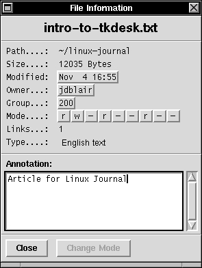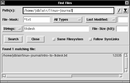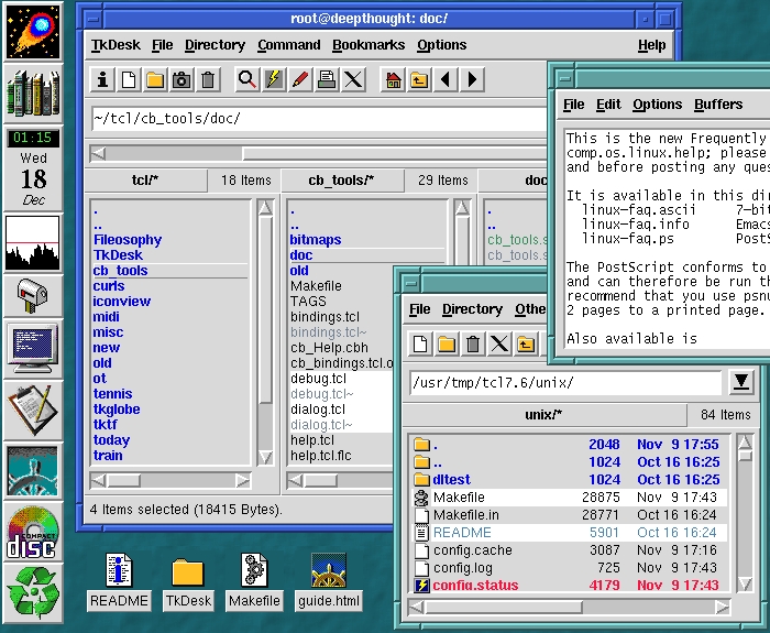 This design allows you to tie specific menu options, icons and other behavior to a file or directory by matching its extension, as one does under Windows. However, it also lets TkDesk react to other types of file patterns, such as Emacs checkpoint files, README files and Makefiles in specific ways. With TkDesk I can now unpack a source distribution, run the configure script and build the system without opening a command prompt. A handful of Tcl functions that could be considered the TkDesk API make writing these code fragments easier and more consistent. One function is used to run a command in the background, displaying notice in the status bar of the file browser when the program starts and exits. This same function adds this command to the command history menu. One function allows you to display your own messages in the status bar. Other functions allow you to ask for confirmation or for strings to be entered, to display the output of programs in the built-in editor, to play sounds, to start commands in the periodic execution tool and more. A “Local” configuration file is even provided should you wish to write your own functions for use in the other configuration files (and I'm sure most readers of this article will sooner or later feel the urge to add their own functions).