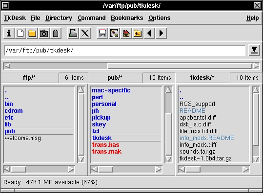 I think the best way to understand TkDesk is to think of it as a kind of universal file selector. TkDesk provides you with a clean, intuitive interface to apply specific commands to different types of files. The built-in commands supported by TkDesk are the types of operations you would expect from any complete file manager: copying, deleting, moving, renaming, linking and symbolic linking. The delete command, like any self respecting desktop manager, can be used to copy files into a “trash can” before permanently deleting them.