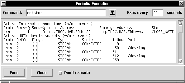 Last, curious if anyone is currently accessing the web server, I run the netstat command. However, I don't run it from the command line. I choose the “netstat” option I have set under the System Statistics icon, which opens the “Periodic Execution” tool, running the netstat command (see Figure 5). The Periodic Execution tool, in this case set to run netstat every 30 seconds, is one of several general purpose tools which TkDesk provides.