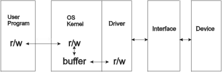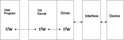 Figure 1 shows the relation between user programs, the OS and the devices. Differences between software and hardware are clearly specified in this scheme. At the left side, user programs may interact with the devices (for example, a hard disk) through a set of high-level library functions. For example, we can open and write to a file of the hard disk calling the C library functions fopen, fprintf and close: