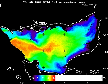 The subsurface waters are generally cooler in the coast than the surface and in Figure 7 this is shown on a coincident thermal image from the AVHRR satellite as the blue, cool area. So the high pigment concentrations in the CZCS image can be explained by the fact that the upwelling event observed in the thermal image has led to the pigments being brought closer to the surface where they are more visible to the CZCS satellite instrument. Also, nutrients upwell with the phytoplankon and as they are closer to the surface, where there is more light, they are able to photosynthesise more effectively and thus form large blooms. This multi-sensor approach to oceanography (using complementary data from different sources, e.g., WAR, thermal and visible imagery) provides a more comprehensive view of a region than would be obtained using only one source of data.
