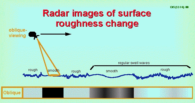 If the sea surface is smooth, i.e., calm conditions, the surface acts like a mirror reflecting the incident beam in a direction away from the satellite. If the sea surface is roughened by wind or currents, then some of this incident beam is reflected back to the satellite and is received by the SAR. Thus, the stronger the backscattered signal, the rougher the sea surface.
