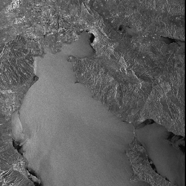 The scene in Figure 4 is a good SAR image of the Gulf of Thermaikos in the Aegean Sea, just off the coast of Greece. The image was taken by the ERS-2 SAR on 25 May 1996 at 20:43 GMT. A number of oceanographic features evident in this image which are of general interest. The numerous black swirls and bands across the water surface correspond to surface slicks. Much of the slick material comes from a river outflow at the edge of the city of Thessaloniki, seen at the top left in the image. This reverine material is concentrated around the top of the bay and is then distributed throughout the gulf by eddies, tides and wind-driven currents. Incidently, the dark square patches around the town are probably rice fields which give very little radar return signal. In the bottom right of the image is the edge of Mount Olympus, mythical home of the Greek gods.