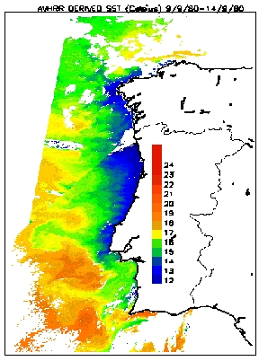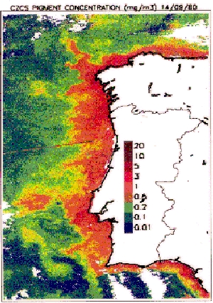 Figure 6 shows an interesting image from the Coastal Zone Colour Scanner (CZCS) which is an instrument which flew on the Nimbus 7 satellite. The instrument is no longer functional but worked well between 1978 and 1985. The image data were acquired on 14/9/80 and show the Western coast of the Iberian Peninsula. The image shows pigment concentration during a strong upwelling event. (Equatorward winds push the water away from the coast, and cool water from beneath the surface is drawn upwards near the coast.) The pigments are produced by phytoplankton.