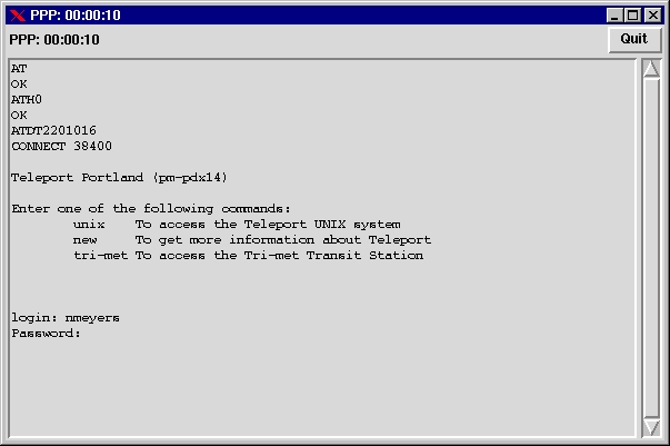 Figure 1 is a screen dump of PPPui taken ten seconds after I established a connection with Teleport, my ISP in Portland. The login sequence is captured in the console, and the clock ticks away in the upper left corner and on the title bar. If I iconify the client, the running clock appears with the icon or in the task bar (depending on your choice of window manager).
