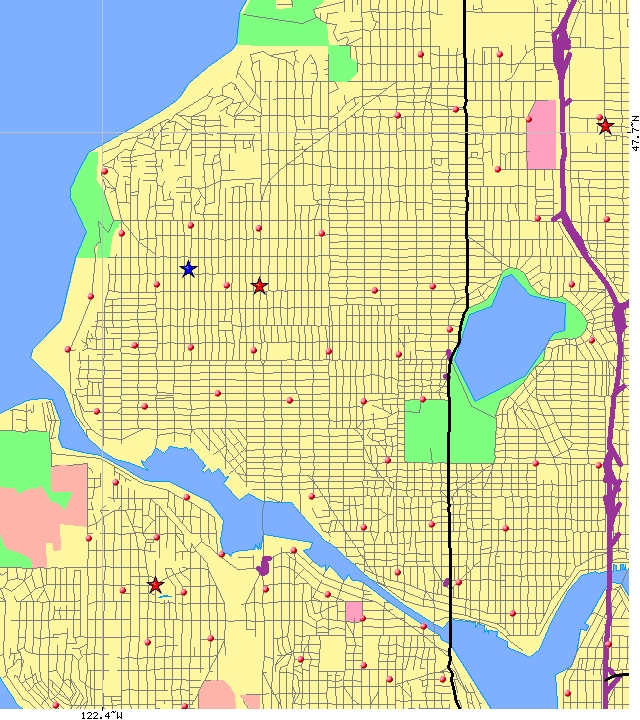 If you pay attention, you'll see cell-phone antenna towers or roof-top clusters appearing everywhere. The Ricochet system is quite a bit harder to spot. There are three elements: the “modem radio” attached to your computer, a shoe box sized “microcell radio” attached to streetlamp poles at quarter mile intervals and “wired access points” to serve thirty or so microcell radios. (Seattle has 1800 microcell radios and 50 wired access points.) For instance, in this map of a Seattle neighborhood the small dots are the microcell radios, the red stars are wired access points, and the blue star is the home of Linux Journal. (The map is a product of a U.S. Census bureau server using the URL (without breaks) https://tiger.census.gov/cgi-bin/mapbrowser? lat=47.676&lon=-122.366&wid=0.10&ht=0.050& on=GRID&murl=https://www.aa.net/~bentson/tms& iwd=640&iht=720. (See Figure 1.)