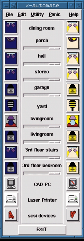 To create your floor plans, I recommend using xfig, saving or converting the file to an “xbm” file for displaying within x-automate. Keep in mind your screen size when designing your floor plan. A separate drawing can be made for each floor or area, with the file names entered in the .x10rc file. Your control icons will be displayed at the x,y coordinates as defined in your .x10rc file, and can be used to control devices in the same way as with “remote control”. Clicking on the edge of the icon and dragging will move the icon on the floor plan and update the x,y coordinates in the configuration, which can be resaved to your .x10rc file. A group of icons in both large and small sizes (for the floor plan) are included in the distribution. Feel free to make your own—if you make some nice ones, send them to me. Now, Linux users can have a fancy home-control GUI, just like that “other” operating system.