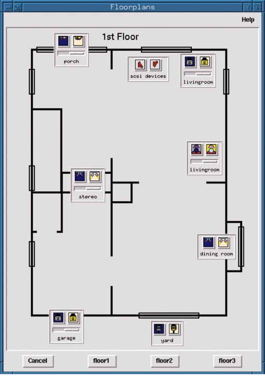 x-automate is a Tcl/Tk frontend that works in conjunction with Aaron's x10-amh. It's fully customizable, with a remote-control-type interface (Figure 1) and an assortment of icons representing a few typical home-automation candidates around my home. In addition to the remote control interface, you can set up floor plans of your home (Figure 2), with the devices placed in a reasonable representation of their actual locations. Carrying the Jetsons' theme one step further, I also wrote a C program, speak, that sends ASCII text through another serial port to a bgmicro Digitalker speech synthesis board which then “says” what the system is doing. This part is optional. You can configure the system without sound or implement another approach such as cat xxx.au > /dev/audio with the appropriate sound file.