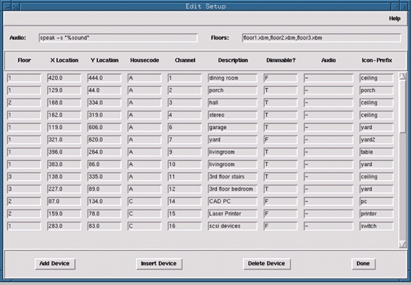 The program includes a tabular input section for modifying your configuration (Figure 3). The screen is much like a spreadsheet, with cells to edit the various parameters for each unit. You need to indicate the floor the unit is on (for multistory facilities), the x,y coordinates of the icon for the floor plan (you can fine-tune this once you load the floor plan), the house code and the unit number. In addition, you need to assign a descriptive phrase for the icon prefix and the device, whether it is dimmable, and the phrase to speak if you're configured for sound. You can tab from field to field, as well as insert and delete rows. Once you're finished, store the setup in your .x10rc file.
