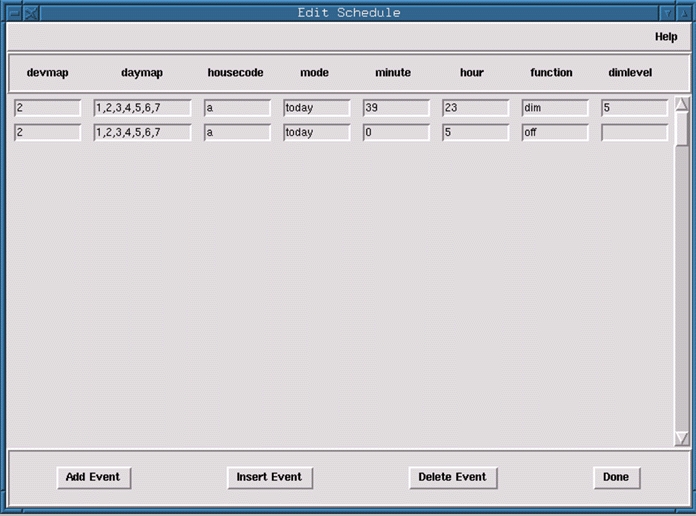 There is also a tabular screen for configuring scheduled events which can be uploaded to the CP290. x10-amh stores event data in the following format: