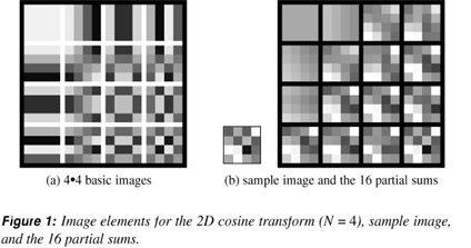 In this section, several examples using the cosine transform are presented. This transform is used by JPEG, applied to 8x8 portions of an image. An NxN cosine transform exists for every N, which exchanges spatial information for frequency information. For the case N=4, a given 4x4 portion of an image can be written as a linear combination of the 16 basis images which appear in Figure 1(a).
