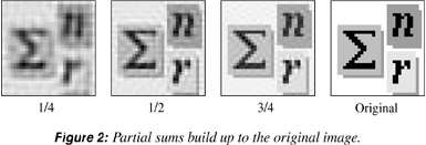 The process of approximation by partial sums is applied to a “real” image in Figure 2, where 1/4, 1/2 and 3/4 of the 1024 terms for a 32x32 image are displayed. These can be generated with calls of the form: