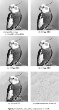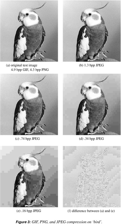 The images in Figure 3 were generated at several “quality” levels, using software from the Independent JPEG Group (see Resources 5). The sizes are given in bits per pixel (bpp); i.e., the number of bits, on average, required to store each of the numbers in the matrix representation of the image. The sizes for the GIF and PNG versions are included for reference. (“Bird” is part of a proposed collection of standard images at the Waterloo BragZone [see Resources 11] and has been modified for the purposes of this article.)