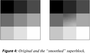 The JPEG decompresser may have only rough estimates about much of the original frequency information, but it typically has fairly good estimates of the average level of gray in each original 8x8 block (because of the way quantizers are chosen). The idea is to use the average gray (DC-coefficient) information of its nearest neighbors to adjust a given block's (AC-coefficient) frequency information. Figure 4 illustrates the process with a single “superblock” consisting of a center 8x8 image and its nearest neighbors. The center block in the image on the right has been “smoothed” by the influence of its nearest neighbors (the surrounding eight 8x8 blocks).