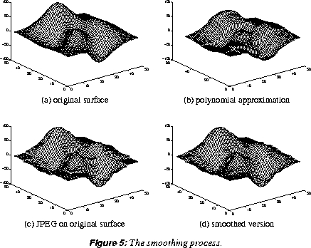 The process on a more complicated image is illustrated in Figure 5. Here, the image is plotted as a surface where, at each pixel (y,x), the height of the surface represents the gray value. For a given 8x8 block, the 3x3 superblock consisting of its nearest neighbors contains 3282 total entries. The polynomial