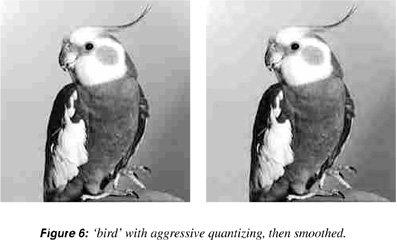 In Figure 5, the lowest five frequencies were considered for adjustment by the predictors: zero values passed by the compressor were replaced by the predicted values (subject to a certain clamping). The procedure applied to an aggressively-quantized bird image appears in Figure 6. The deblock.m script (see Resources 4) performs the smoothing. The following code was used to generate the right-hand image: