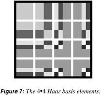 In this section, we present an example using the Haar wavelet, which in one sense is the simplest of wavelets. The 16 basis elements in Figure 7 form a basis for the set of 4x4 images. Compare these with the cosine transform elements in Figure 1. One can begin to see the formation of elements with localized supports even at this “coarse” resolution level.