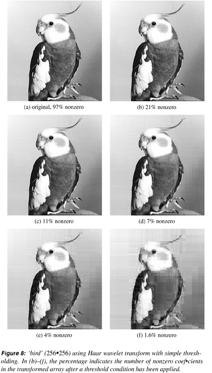 The simple (lossy) compression scheme used in the example is not as elaborate as the quantizing scheme used in JPEG. Basically, we throw away any weight which is smaller than some selected threshold value. In Figure 8, we have used this simple scheme on “bird” at several tolerance settings.