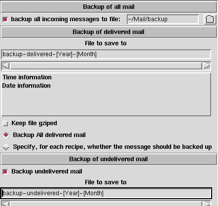 In the first method, the full file name must be specified. This is because this method has to be 100% foolproof. In the other two methods, you may build the file names from the current date and time. This makes it possible to save this sort of mail to folders for the current year/month/week, e.g., a folder called backup-delivered-1997-July. As an additional feature, you may compress the files as gzipped files.