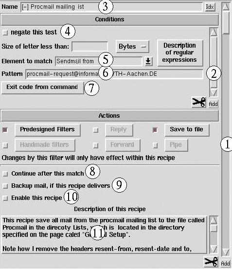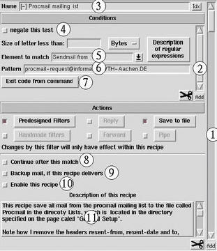 So far, I have mentioned that you can type a regular expression in box (6). In most cases, it may not be necessary to know anything about regular expressions since the procmail module will take care of most of it for you. One thing may be worth knowing, and that is that you may match “anything” with ".*". This means that abc.*def will match anything which starts with abc and ends with def, e.g., abcdef or abcXXXXdef. To read a more detailed description of the set of regular expressions used by procmail, press the button labeled Description.