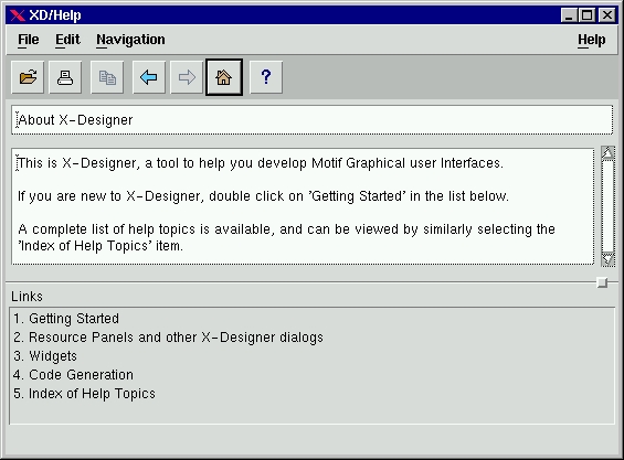 With X-Designer, an on-line help subsystem can be created for the new applications. All help is written in HTML files with anchors as documented in the User's guide. You must only decide whether your application will use XD/Help, Netscape or FrameMaker for the help browser—just link an additional provided object file with your application.