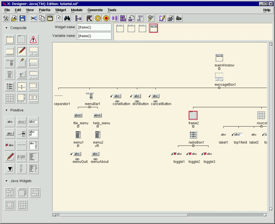 Portability is an important issue today, so I set out to explore the Java and Microsoft Windows code generation options. I had a design targeted for a Motif/C combination, and I tried to change it to Java code. Of course, the callback code was useless; I didn't expect X-Designer to translate my C code into Java code, but links also work in Java. The prerequisite for Java designs is to include the path to a set of Java classes, which are provided with X-Designer, in the CLASSPATH variable. The classes are put into the package called uk.co.ist.mwt. They provide components which have counterparts in Motif but are missing in Java. There are also some widgets which are added to the standard Motif set to implement some Java components not present in Motif. They are container widgets, such as the Card Widget, Flow Widget, Border Widget, Grid Widget and GridBag Widget. This enables the WYSIWYG development of Java applications.