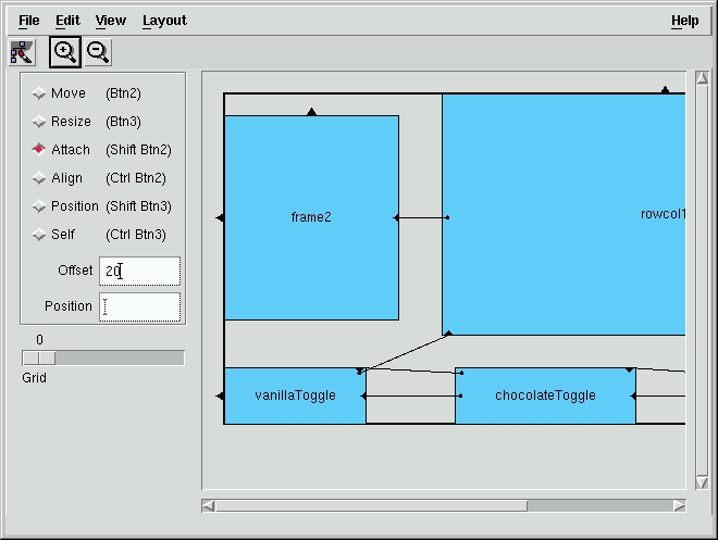 Installation provides many configurations for common widget sets, and I tested the Athena widget set which worked fine. I can now build GUIs with the Athena widget set, forgetting Motif. The only drawback to this process is the fact that new widgets are compiled into X-Designer itself. If for some reason, the widgets cause segmentation faults or otherwise behave badly, X-Designer may crash. I actually managed to crash it by laying out Athena widgets in an invalid hierarchy. Creating successful widget configurations requires deep knowledge of the widgets, C, make and X-Designer.