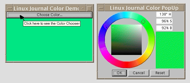 Figures 1 and 2 are UNIX screen shots of the color chooser (with tool tips) and the TreeView program; the source for these and all other examples shown here is on the FTP site.